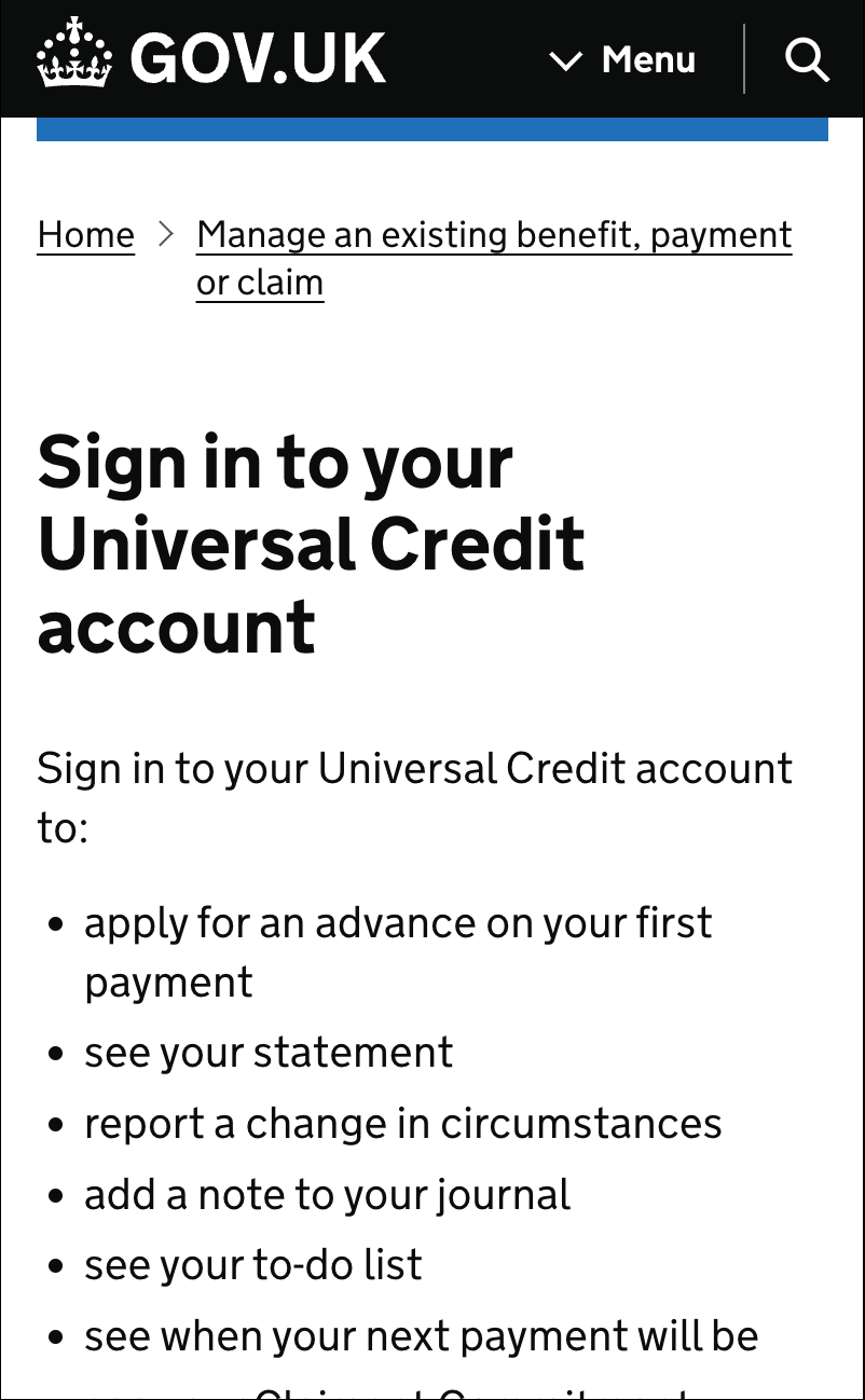 If you select that item, it will open the https://gov.uk/sign-in-universal-credit web page as a view in the app, just as you would see it in your mobile web browser.